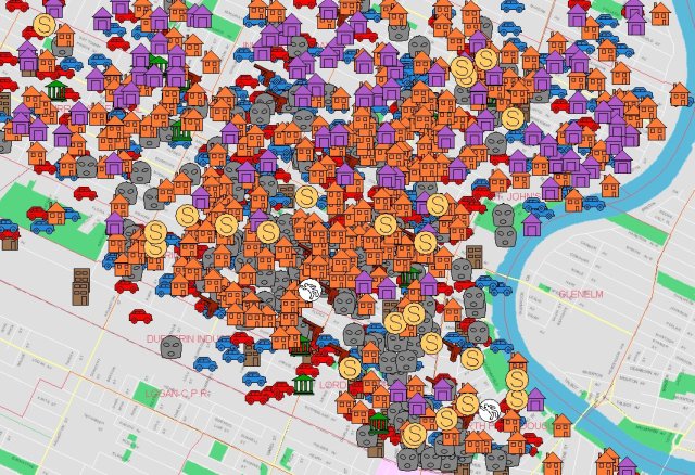 The crime rate in these neighbourhoods is such that the icons depicting the various crimes overlap each other and it is difficult to appreciate the severity of the problem. For the sake of clarity one needs to eliminate some of the crime types. The image below illustrates the violent crimes (murder, shootings, robberies and sexual assault) for the area in question.