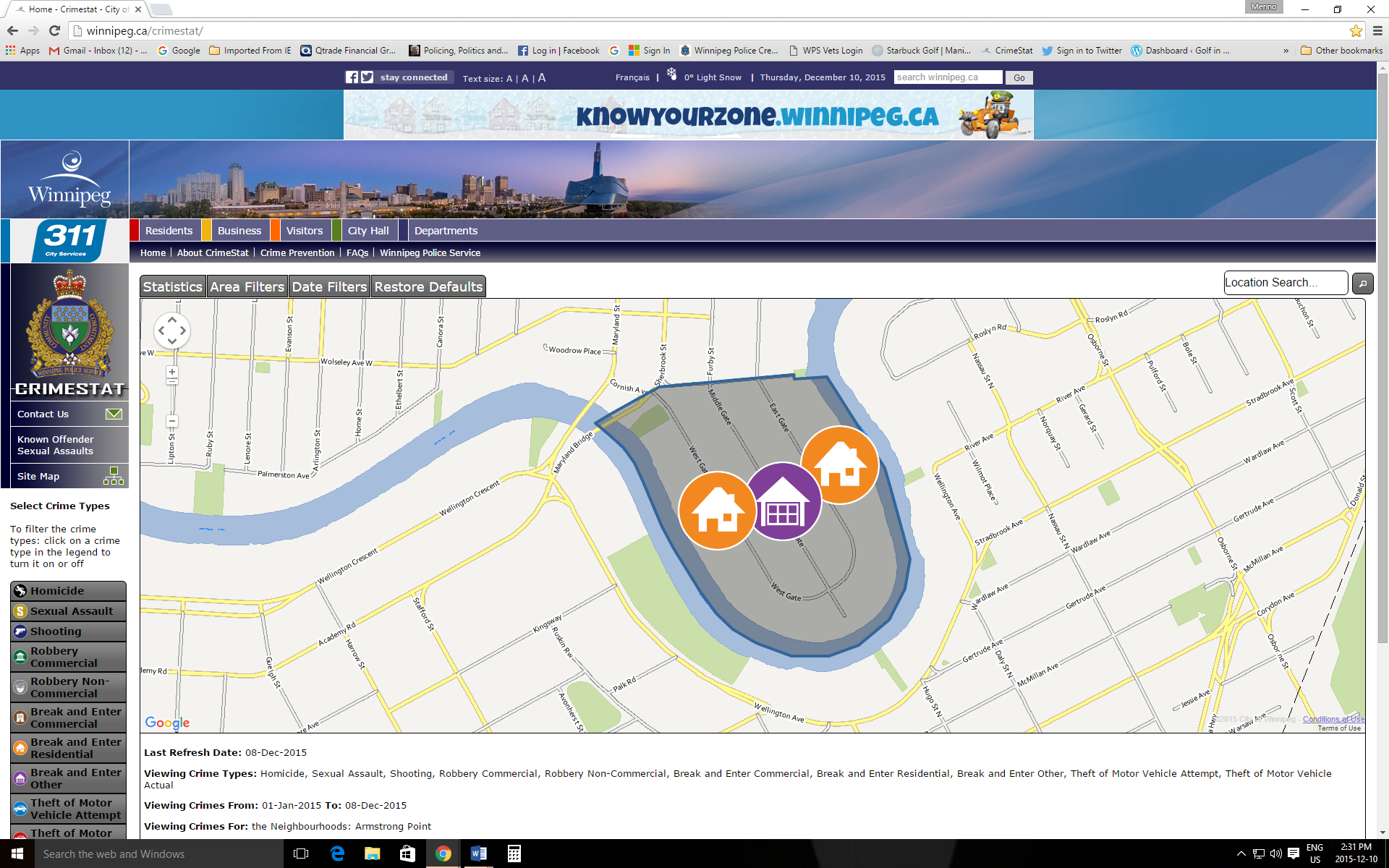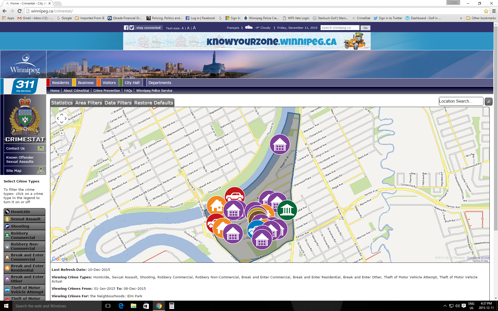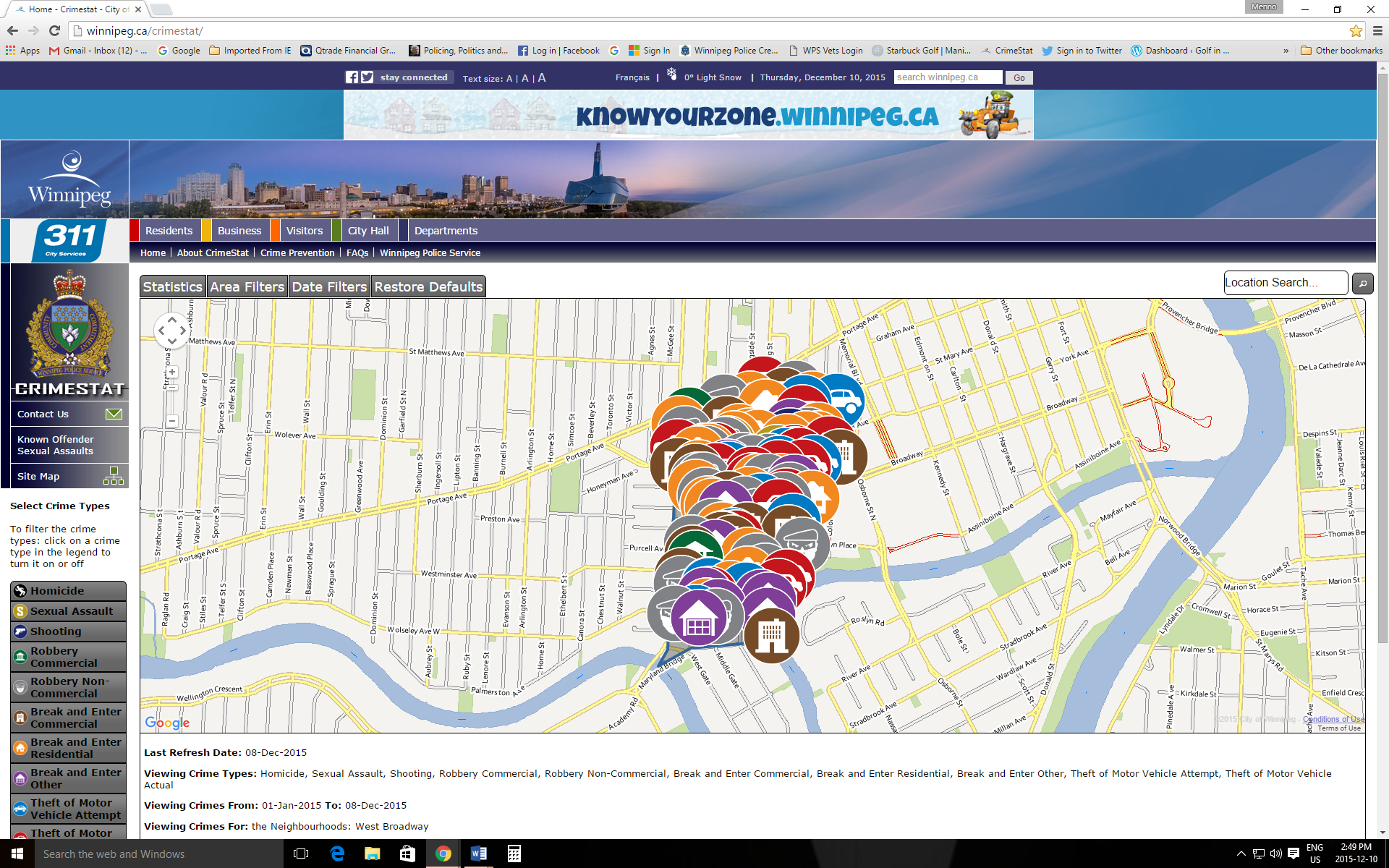 All the screenshots in this post were taken from the City of Winnipeg Crimestat website and depict reported crime for the offences reported on Crimestat for the period between January 1, 2015 and December 10, 2015. The screen shots were taken on December 8th, 2015.