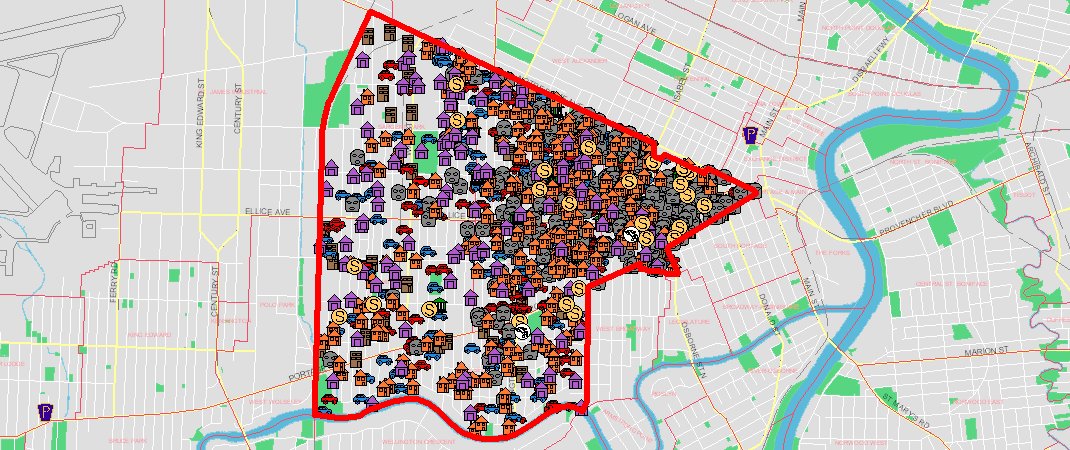 The map below displays reported crime for the ten offenses tracked by Crimestat for the Daniel McIntyre Ward for the period of June 2009 to May 2010